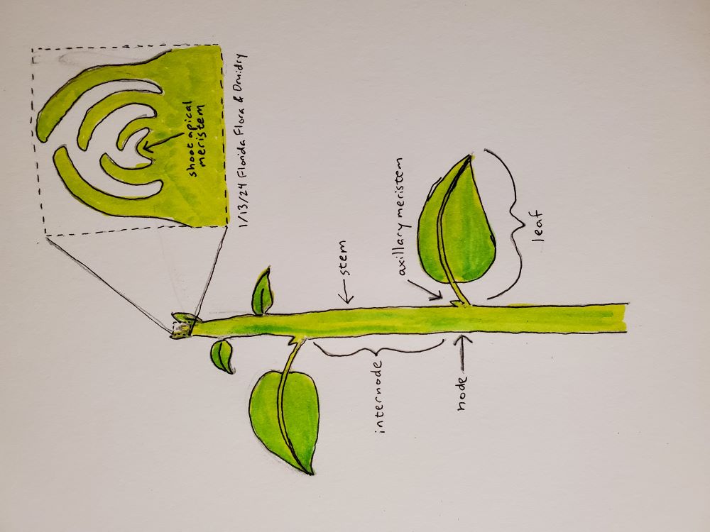 Along the stem, you will find sections called “node” and “internode”. The internode is just stem and doesn’t have the capacity to grow into anything else. The node is where you find a leaf and a bud or branch.