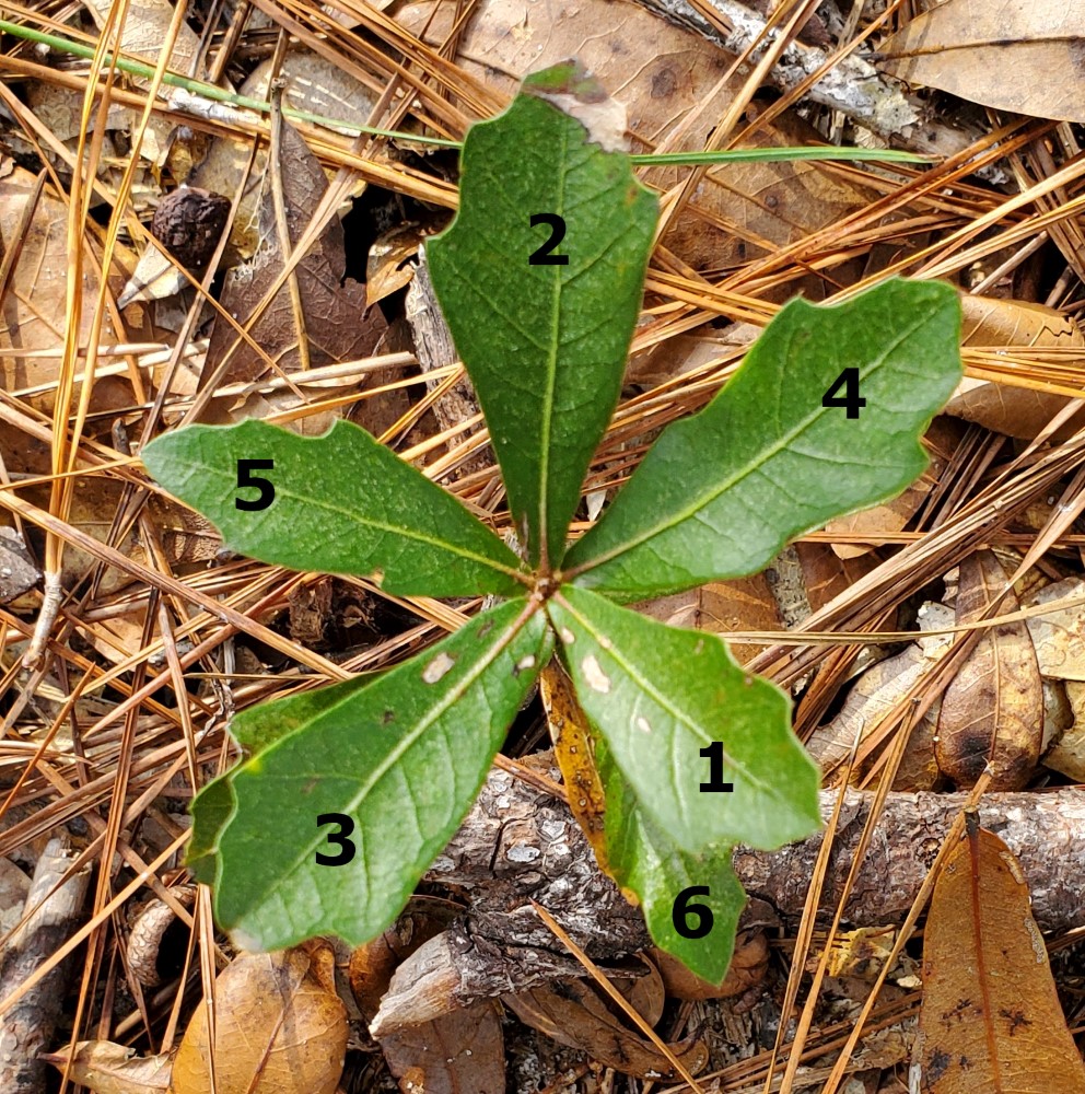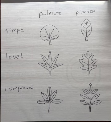 Leaves can be simple, lobed, or compound. A compound leaf with many leaflets is still just one leaf, anatomically speaking. If the veins all radiate out from one central point, it is called “palmate”, and if they come out from a central axis it is called “pinnate”.