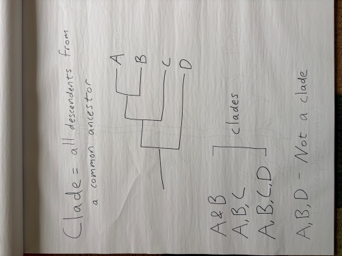 I will use the term “clade” to refer to a group of organisms all arising from one common ancestor.