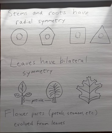 Roots and stems have radial symmetry. Leaves have bilateral symmetry. Flower parts like petals and stamens evolved from leaves. The stalk that connects the leaf to the stem is called a petiole and is part of the leaf.