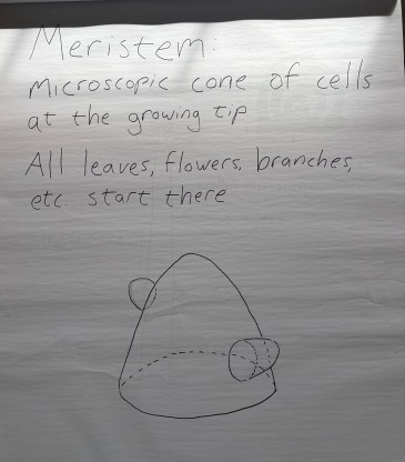 The equivalent of “stem cells” in a plant is a microscopic cone of cells called the meristem. These are found at the growing tip of a root or shoot. Right above where a leaf connects to a stem you will usually also find a dormant meristem, which can grow into a new branch if the plant is injured. Shoot meristems usually aren’t exposed to the open air, but instead are wrapped in very young leaves, forming a bud.