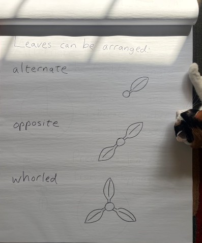 The way that flowers and leaves are patterned around the axis of the stem is called “phyllotaxis” and starts as little bumps that emerge on the meristem. Those bumps send hormonal signals so that they are spaced apart nicely. When two leaves emerge at the same node, 180° from each other, it is called “opposite”. When one leaf emerges from a node, and the next leaf emerges from the other side of the next node, it is called “alternate”.
