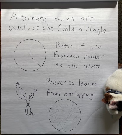 Alternate leaves almost never emerge 180° from each other. They usually emerge at the golden angle, which is a little more than a third of the way around the circle. Because the golden ratio is an irrational number, this means that two leaves will never be stacked directly on top of each other. This also results in spiral patterns in which we can see Fibonacci numbers (see blog post).