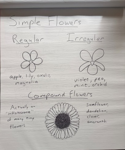 Find a plant that is flowering. Is it a compound flower or a simple flower? Is the flower regular or irregular? If the flower is big enough, can you identify the four whorls of organs?