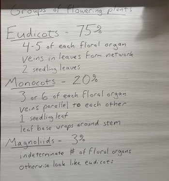 Most flowering plants fall into these three groups: Eudicots, Monocots, and Magnoliids. These three all diverged from each other around the same time. A few other groups, like water lilies, diverged earlier.